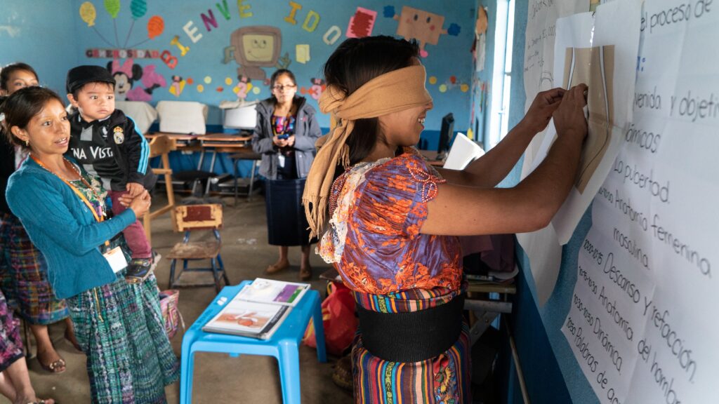 In the community of Los Manantiales, in Santa Lucía Utatlán, a small group of indigenous Maya women are playing pin the body part on the woman. One stands in front, blindfolded, while the others tell her where she should place the paper image of a fallopian tube. After much laughter, she successfully pins it in the right place and rips her blindfold off with a smile. The women are participating in their first Women’s Health workshop with Wuqu’ Kawoq – Maya Health Alliance. Lesson number one – learning the female and male anatomy.